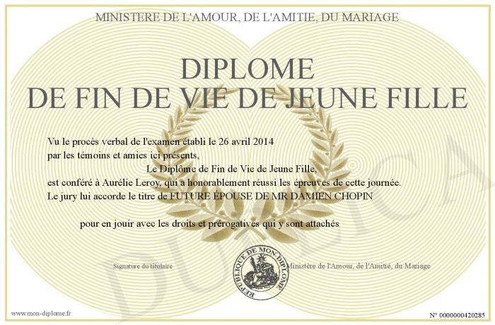 Envoyez par email votre Diplôme de Fin de Vie de Jeune Fille personalisé