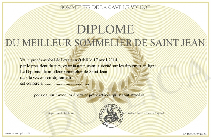 Envoyez par email votre Diplôme du meilleur sommelier de Saint Jean personalisé