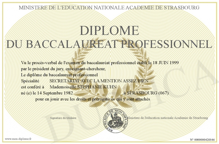 Envoyez par email votre Diplôme du baccalaureat professionnel personalisé