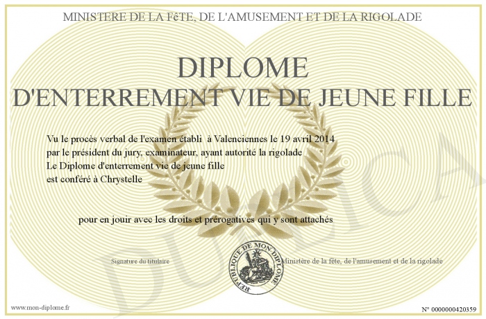 Envoyez par email votre Diplôme d'enterrement vie de jeune fille personalisé