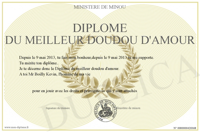 Envoyez par email votre Diplôme du meilleur doudou d'amour personalisé