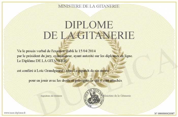 Envoyez par email votre Diplôme de LA GITANERIE personalisé