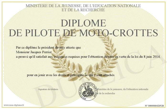 Envoyez par email votre Diplôme de pilote de moto-crottes personalisé