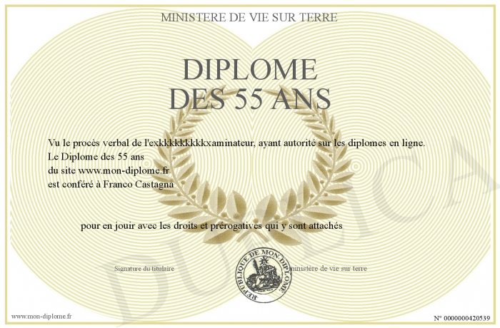 Envoyez par email votre Diplôme des 55 ans personalisé