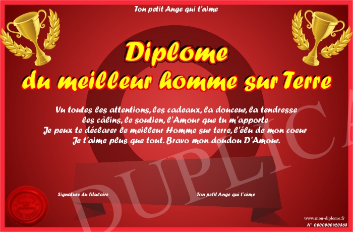 Envoyez par email votre Diplôme du meilleur homme sur Terre personalisé