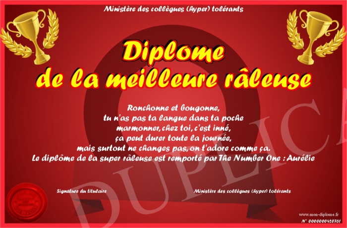 Envoyez par email votre Diplôme de la meilleure râleuse personalisé