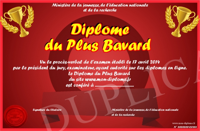 Envoyez par email votre Diplôme du Plus Bavard personalisé