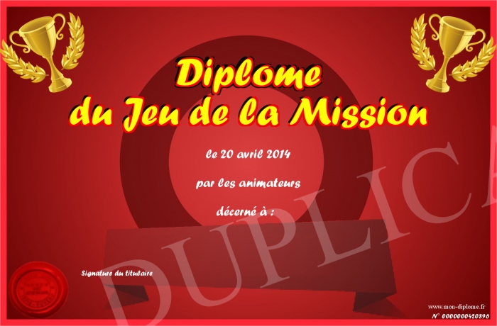 Envoyez par email votre Diplôme du Jeu de la Mission personalisé