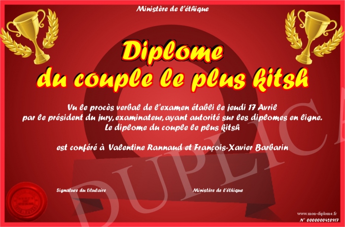 Envoyez par email votre Diplôme du couple le plus kitsh personalisé