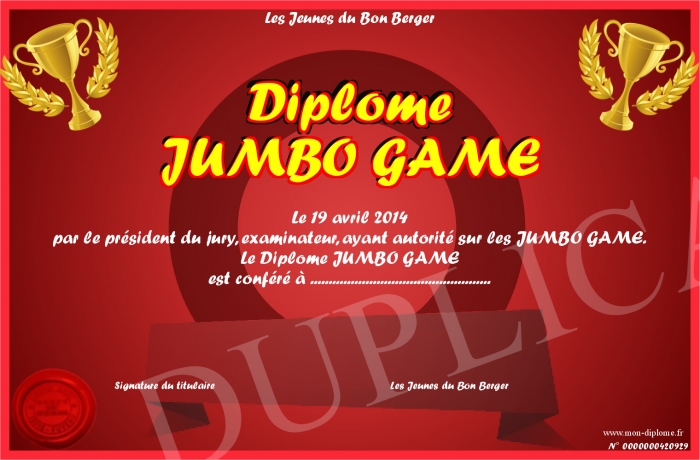 Envoyez par email votre Diplôme JUMBO GAME personalisé
