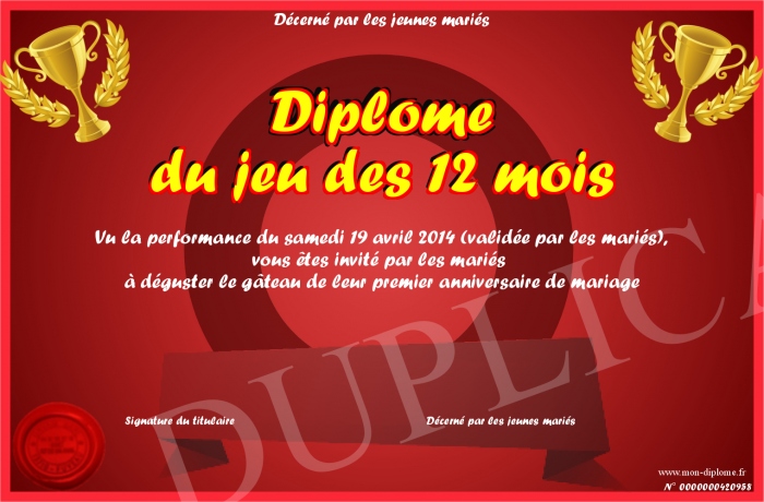Envoyez par email votre Diplôme du jeu des 12 mois personalisé