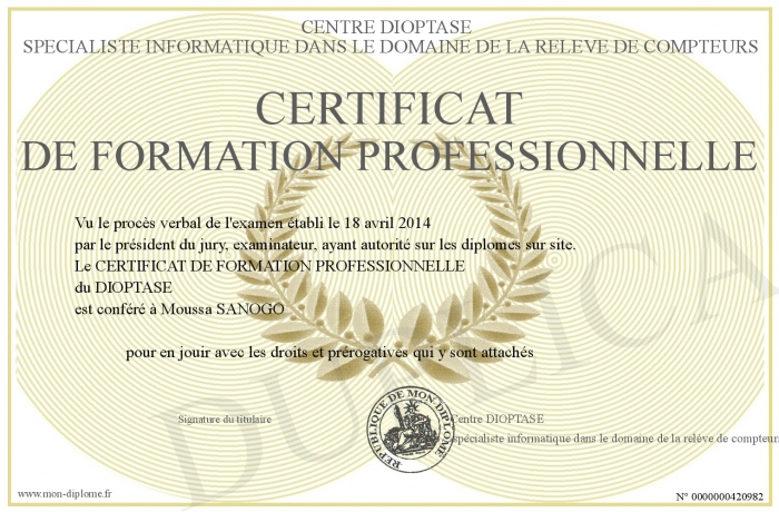 Envoyez par email votre CERTIFICAT DE FORMATION PROFESSIONNELLE personalisé