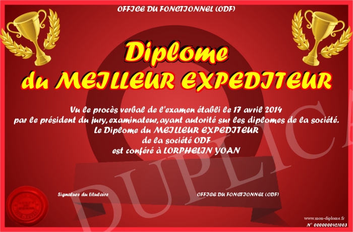 Envoyez par email votre Diplôme du MEILLEUR EXPEDITEUR personalisé