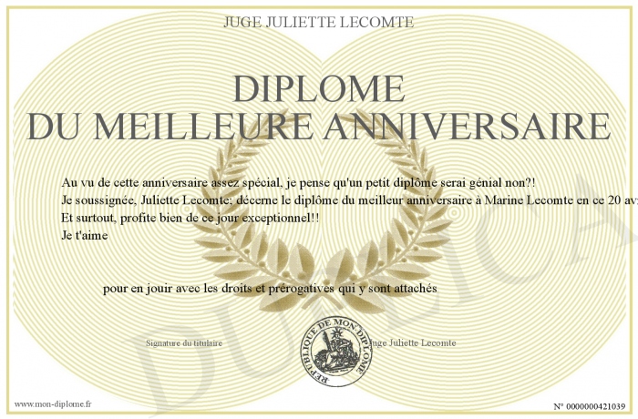 Envoyez par email votre Diplôme du meilleure anniversaire personalisé