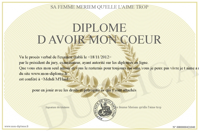 Envoyez par email votre Diplôme d avoir mon coeur personalisé