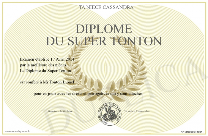 Envoyez par email votre Diplôme du Super Tonton personalisé