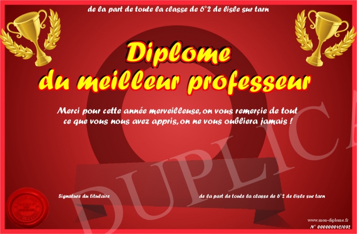 Envoyez par email votre Diplôme du meilleur professeur personalisé