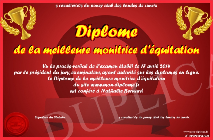 Envoyez par email votre Diplôme de la meilleure monitrice d'équitation personalisé