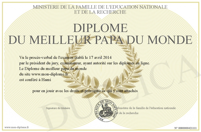 Envoyez par email votre Diplôme du meilleur papa du monde personalisé