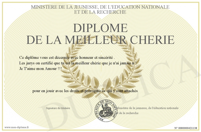Envoyez par email votre Diplôme de la meilleur chérie personalisé