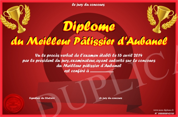 Envoyez par email votre Diplôme du Meilleur Pâtissier d'Aubanel personalisé