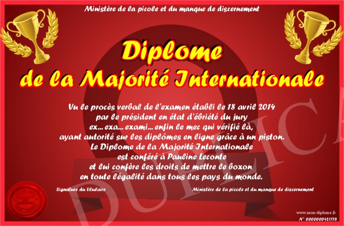 Envoyez par email votre Diplôme de la Majorité Internationale personalisé