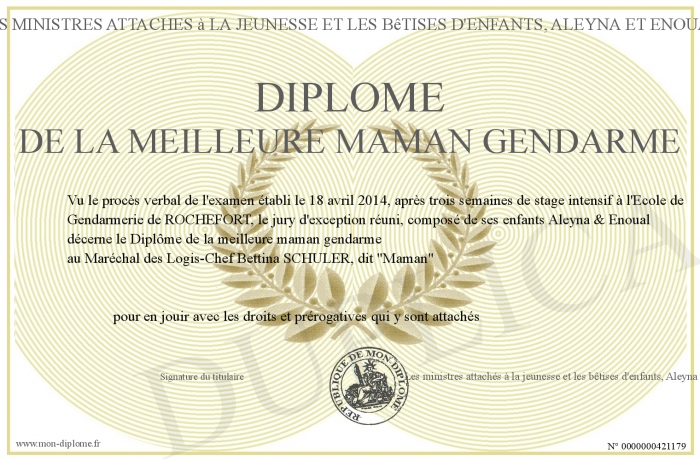 Envoyez par email votre Diplôme de la meilleure maman gendarme personalisé