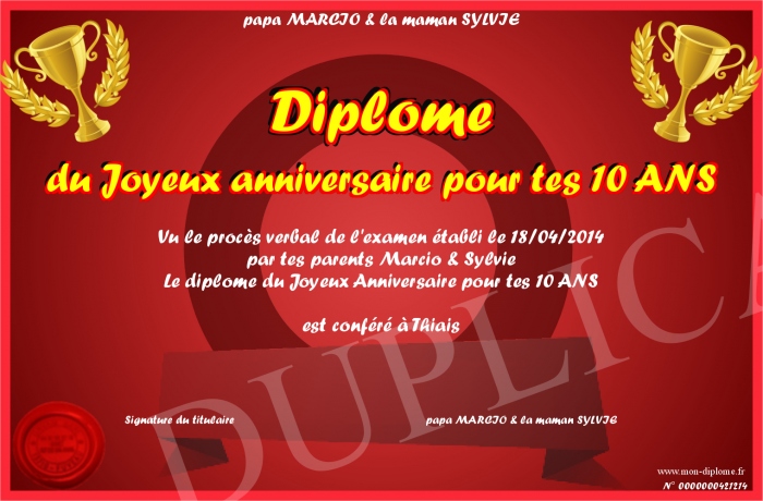 Envoyez par email votre Diplôme du Joyeux anniversaire pour tes 10 ANS personalisé