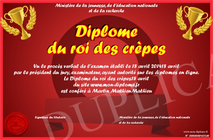 Envoyez par email votre Diplôme du roi des crèpes personalisé