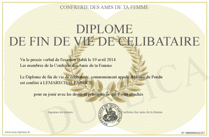 Envoyez par email votre Diplôme de fin de vie de célibataire personalisé