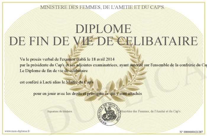 Envoyez par email votre Diplôme de fin de vie de célibataire personalisé