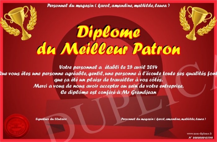 Envoyez par email votre Diplôme du Meilleur Patron personalisé