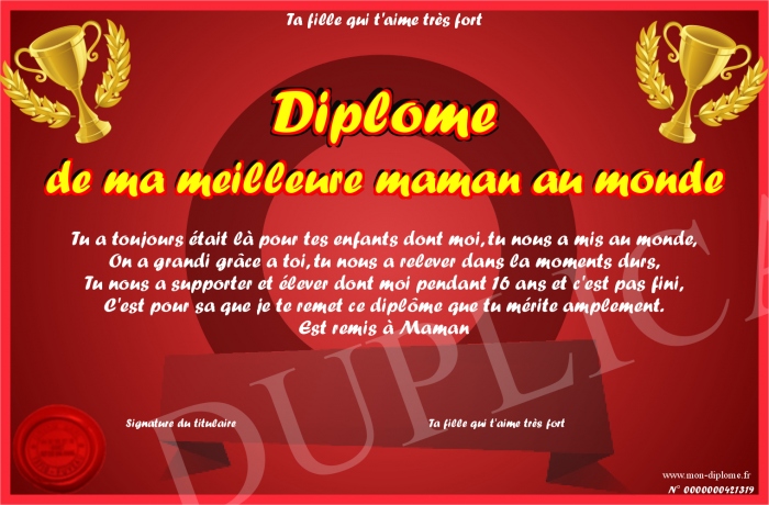 Envoyez par email votre Diplôme de ma meilleure maman au monde personalisé