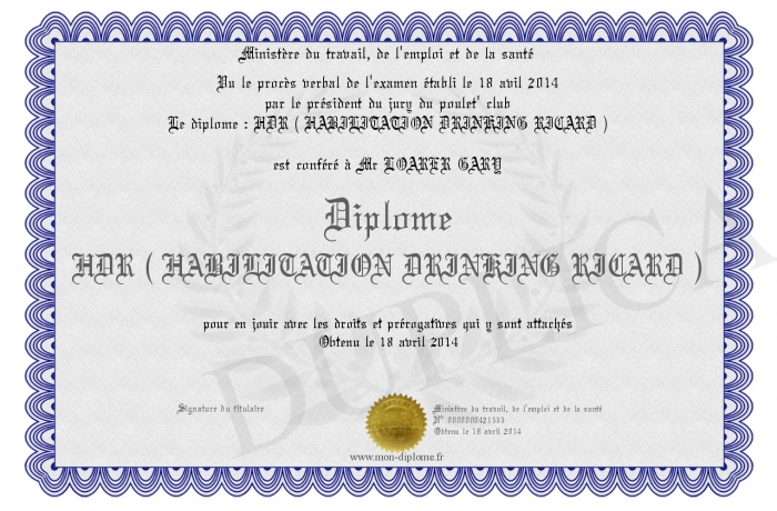 Envoyez par email votre Diplome HDR ( HABILITATION DRINKING RICARD ) personalisé
