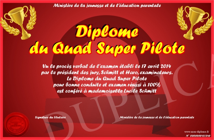 Envoyez par email votre Diplôme du Quad Super Pilote personalisé