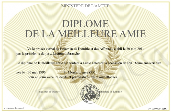 Envoyez par email votre Diplôme de la meilleure amie personalisé