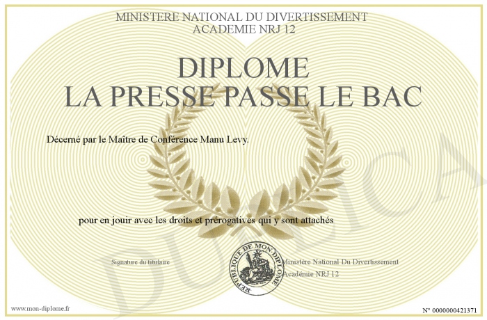 Envoyez par email votre Diplôme La Presse passe le bac personalisé