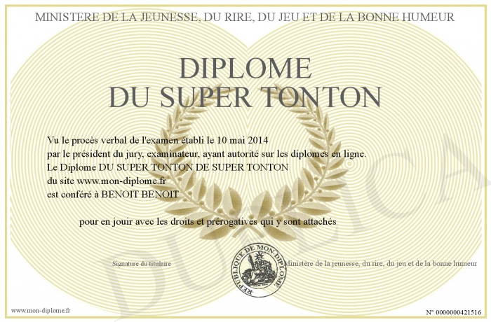 Envoyez par email votre Diplôme DU SUPER TONTON personalisé