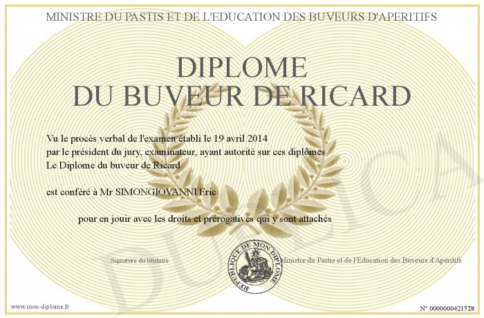 Envoyez par email votre Diplôme du buveur de Ricard personalisé