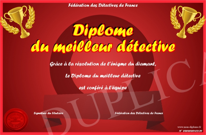 Envoyez par email votre Diplôme du meilleur détective personalisé