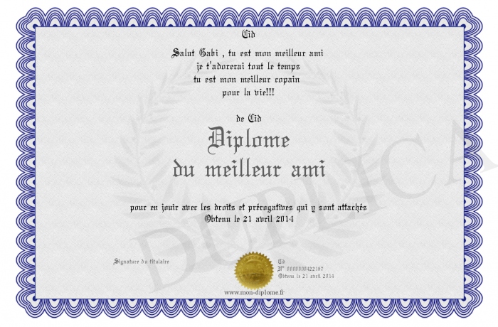 Envoyez par email votre Diplôme du meilleur ami personalisé