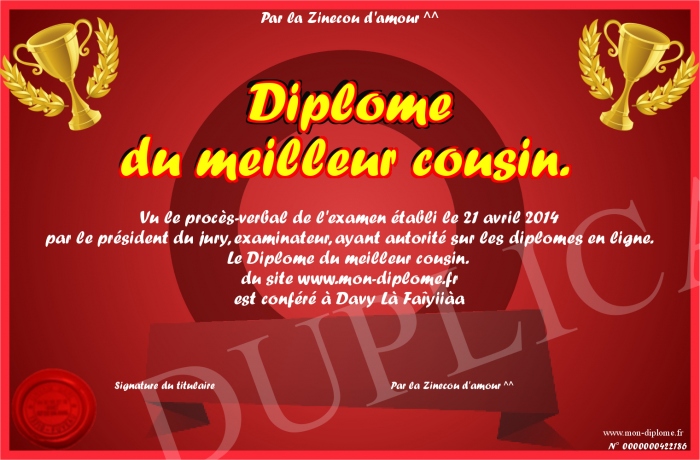 Envoyez par email votre Diplôme du meilleur cousin. personalisé