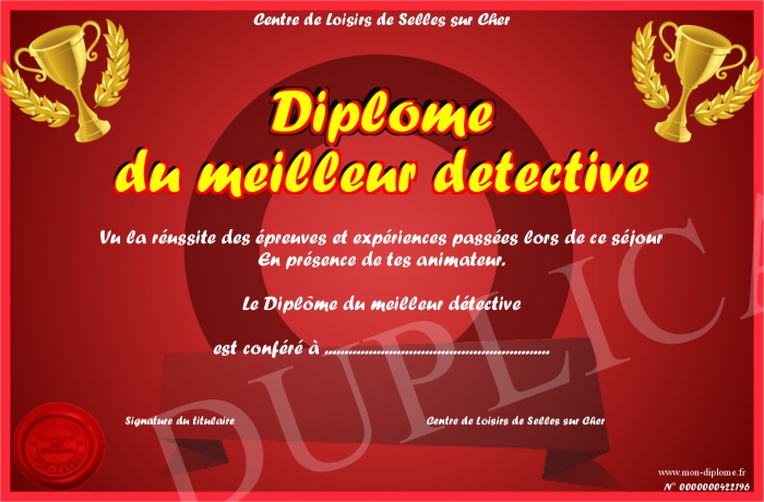 Envoyez par email votre Diplôme du meilleur detective personalisé