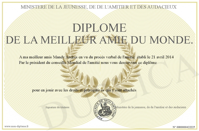 Envoyez par email votre Diplôme de la meilleur amie du monde. personalisé