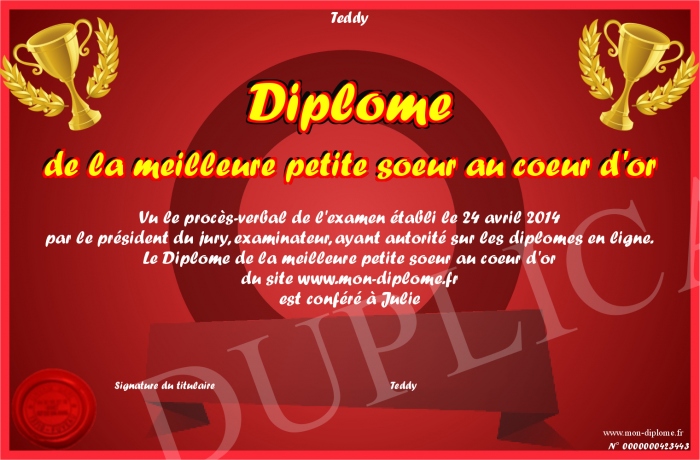 Envoyez par email votre Diplôme de la meilleure petite soeur au coeur d'or personalisé