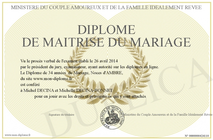 Envoyez par email votre Diplôme de Maitrise du Mariage personalisé