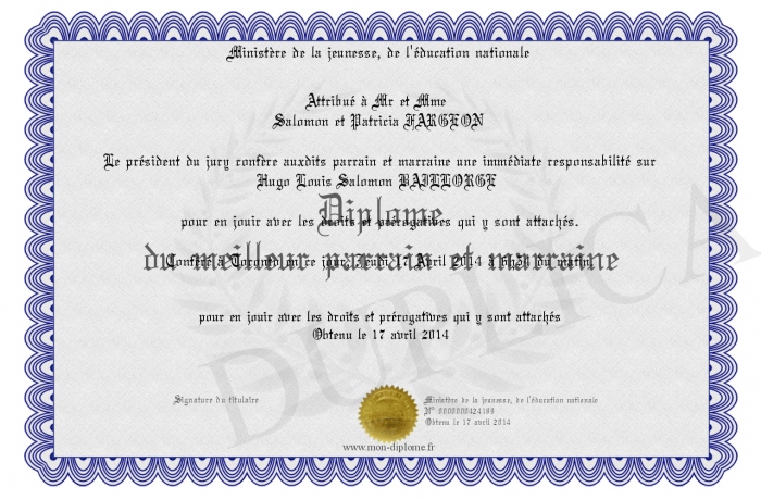 Envoyez par email votre Diplôme du meilleur parrain et marraine personalisé