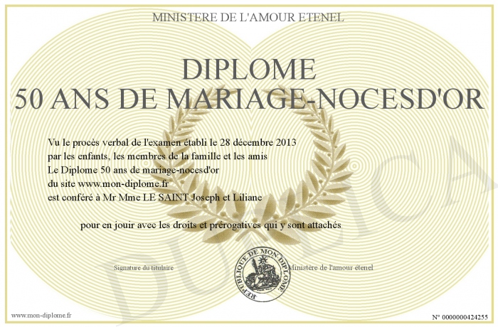 Envoyez par email votre Diplôme 50 ans de mariage-nocesd'or personalisé