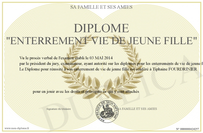 Envoyez par email votre Diplôme -ENTERREMENT VIE DE JEUNE FILLE- personalisé
