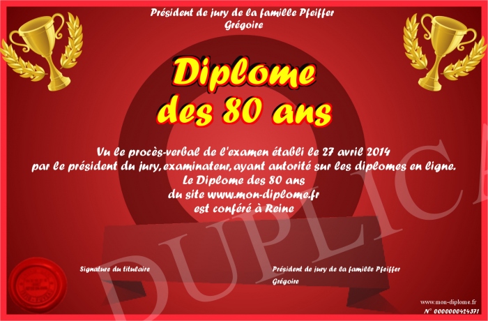 Envoyez par email votre Diplôme des 80 ans personalisé